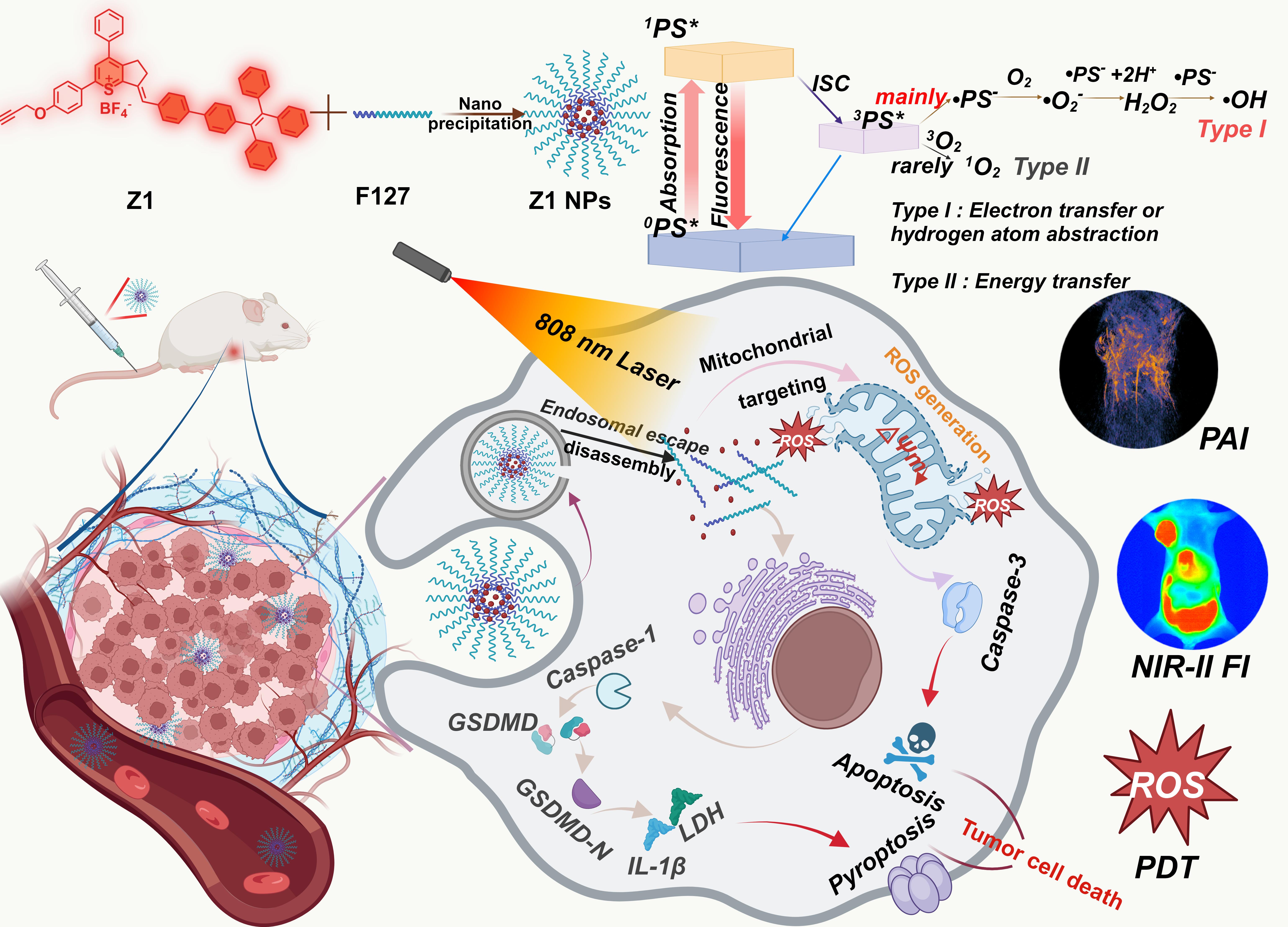 王犇同学在近红外二区小分子探针设计及生物应用领域取得重要研究进展。细胞焦亡又称细胞炎性坏死,是一种程序性细胞死亡,表现为细胞不断胀大直至细胞膜破裂,导致细胞内容物的释放进而激活强烈的炎症反应。细胞焦亡是由gasdermin介导的细胞程序性坏死,在癌症治疗中潜力巨大。光动力治疗(PDT)可以通过光敏剂(PS)产生活性氧(ROS)进而诱导细胞焦亡。然而,许多PS缺乏对特定亚细胞的靶向性,且局限于NIR-I荧光成像,在一定程度上降低了治疗效果。因此,开发具有细胞器靶向功能、高穿透深度的细胞焦亡介导的光疗对于癌症治疗至关重要。针对上述问题,该团队开发了四种具有不同苯环数的硫吡啶结构分子Z1-Z4,初步探索它们的光动力性能。其中,Z1具有更高的苯环占比,表现出优异的ROS生成和线粒体靶向能力以及大的斯托克斯位移。通过两亲性聚合物F127将Z1包覆,制备了Z1 NPs。Z1 NPs在808 nm激光照射下表现出高ROS生成(尤其是I型ROS),可引起线粒体功能障碍,并通过细胞焦亡和细胞凋亡有效抑制肿瘤生长,且副作用最小。此外,该Z1 NPs还能实现活体NIR-II荧光成像和光声成像。相关成果以“A Mitochondria-Targeted Photosensitizer for Combined Pyroptosis and Apoptosis with NIR-II Fluorescence/Photoacoustic Imaging-Guided Phototherapy”为题在化学领域国际顶级学术期刊Angewandte Chemie International Edition(《德国应用化学》)上发表。suncitygroup太阳集团范曲立教授、尹超教授和青年教师周晖为论文共同通讯作者,本科生王犇为论文第一作者,suncitygroup太阳集团为第一署名单位。相关研究得到了国家自然科学基金、江苏省自然科学基金、江苏特聘教授计划、江苏省高等公司自然科学研究面上项目、有机电子与信息显示国家重点实验室主任基金等项目的支持。