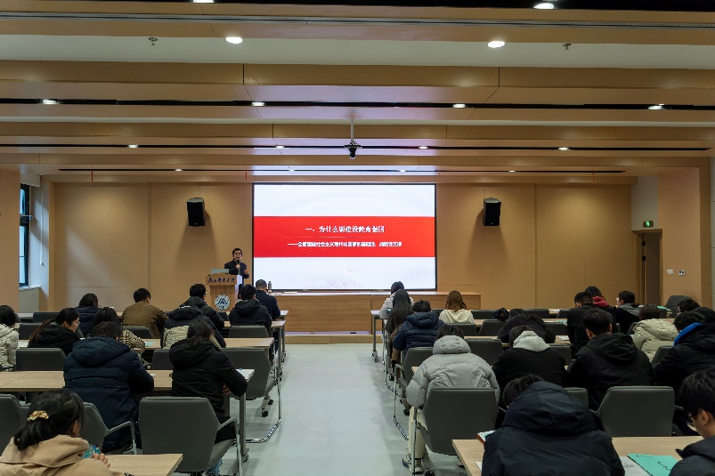 赖风教授的报告由《习近平在中国共产党第二十次全国代表大会上的报告》引入,围绕为什么要建设教育强国、怎样加快建设教育强国展开。建设教育强国是全面建设社会主义现代化国家的基础性、战略性支撑,是时代的需要,更是中国式现代化的必然选择。习近平总书记坚持教育优先发展、科技自立自强、人才引领驱动是中国式现代化的必然选择。赖风教授结合习近平总书记关于教育的重要论述中的“九个坚持”,指出要建成中国特色社会主义教育强国,最终是要办好人民满意的教育。要坚持把教师队伍建设作为基础工作,勉励各位教师做“有理想信念 有道德情操 有扎实学识 有仁爱之心”四有好老师。