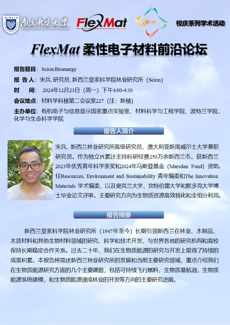FlexMat柔性电子材料前沿论坛: 新西兰皇家科公司林业研究所(Scion) 宋兵 研究员