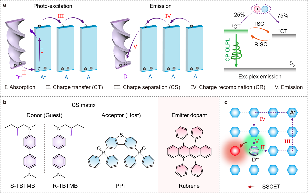 图1.实现多彩圆偏振有机长持续发光体系的原理和分子设计图