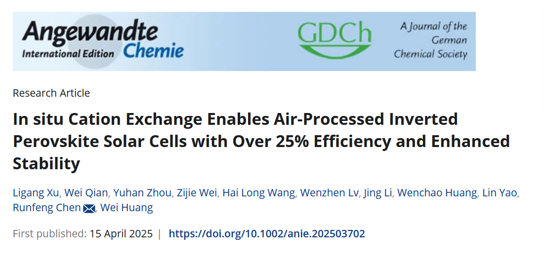 近日,suncitygroup太阳集团柔性电子全国重点实验室黄维院士团队的许利刚副教授和陈润锋教授在反式钙钛矿太阳电池领域取得进展。针对反式钙钛矿太阳电池空气制备的难题,团队成员提出表面原位阳离子交换反应的新策略,器件效率突破25%,并具有优异的工作稳定性。相关成果以“In situ Cation Exchange Enables Air-Processed Inverted Perovskite Solar Cells with Over 25% Efficiency and Enhanced Stability为题在Angewandte Chemie International Edition《德国应用化学》上发表。研究生钱为是员工第一作者。