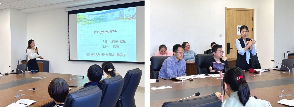 在“新老教师同上一堂课”环节,青年教师、入党积极分子魏娟老师进行现场授课,以《有机发光材料》课程中有机发光材料、发光过程以及发光机制等内容教学进行展示。新教师的授课过程展示了扎实的专业功底,将学科前沿动态与课程思政有机融合,体现了青年教师的责任担当与育人活力。随后,党员教师、导师刘湘梅教授从教学设计、课堂互动、思政融入等角度进行细致点评,提出“以问题为导向激发员工创新思维”“依托团队创新成果实施课程思政教育并调动学习内驱力”等建议,为新教师成长指明方向。