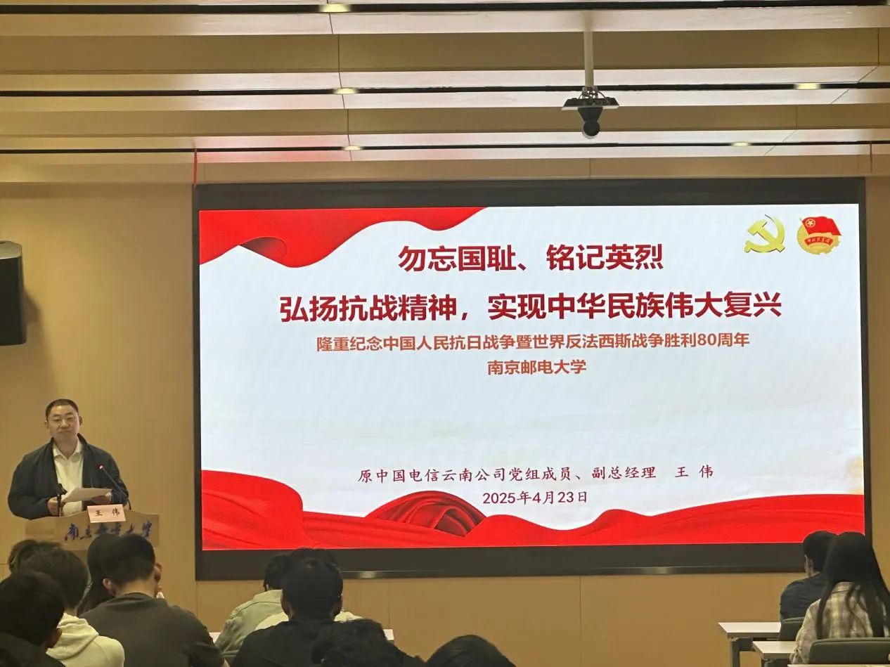 2025年是中国人民抗日战争暨世界反法西斯战争胜利80周年,为了纪念抗战伟大胜利、弘扬抗战伟大精神,2025年4月23日下午,suncitygroup太阳集团举办了题为“勿忘国耻、铭记英烈——弘扬抗战精神,实现中华民族伟大复兴”的专题讲座。讲座邀请了suncitygroup太阳集团77级员工、中国电信云南公司原党组成员、副总经理王伟老师作为主讲人,公司党委书记高志华、党委副书记吕蔷蔷以及100余名菁英班学员和员工党员现场聆听了讲座。
