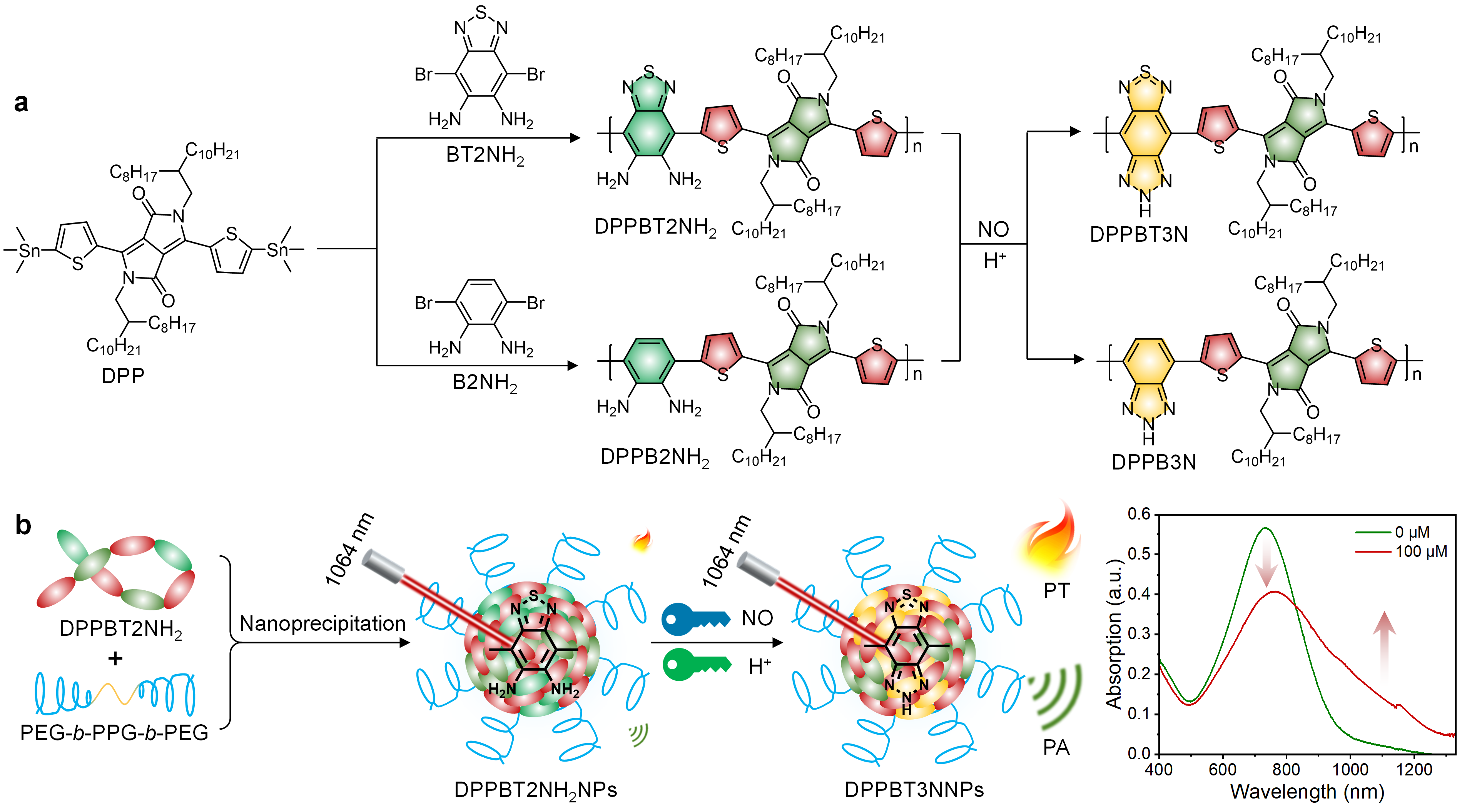 基于此,团队开发了一种一氧化氮(NO)与酸双重刺激下响应的共轭高分子纳米探针,用于可激活的NIR-II光声成像(PAI)和光热治疗(PTT)。该研究将弱电子受体(苯并[c][1,2,5]噻二唑-5,6-二胺,BT2NH2)与二酮吡咯并吡咯(DPP)通过Stille偶联反应共轭连接,构建了病理因子敏感型共轭高分子探针。在NO和弱酸的共同激活下,BT2NH2被氧化生成强电子受体(5H-[1,2,3]三唑并[4,5-f]-2,1,3-苯并噻二唑,BT3N),进而导致其NIR-II区吸收增强。体外和体内研究表明,该探针可被激活的巨噬细胞、多种癌细胞、药物性肝损伤及乳腺癌病灶成功激活,其NIR-II光声与光热信号显著提升,从而实现病灶位点高特异性PAI和PTT,显著降低成像背景信号干扰和治疗的副作用。凭借其增强的特异性和优异的组织穿透深度,该双病理因子智能响应型NIR-II纳米探针在实现活体深层组织相关病理/生理过程的精准可视化及干预方面具有广阔的应用前景。