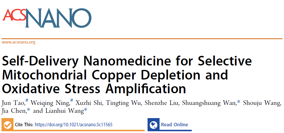 近日,suncitygroup太阳集团柔性电子全国重点实验室汪联辉教授团队在自递送纳米药物领域取得新进展。相关成果以“Self-Delivery Nanomedicine for Selective Mitochondrial Copper Depletion and Oxidative Stress Amplification”为题发表在国际学术期刊Acs Nano上。重点实验室汪联辉教授、万双双副教授及山东第一医科大学陈嘉副教授为共同通讯作者,青年教师陶俊和硕士生宁维青为论文共同第一作者。