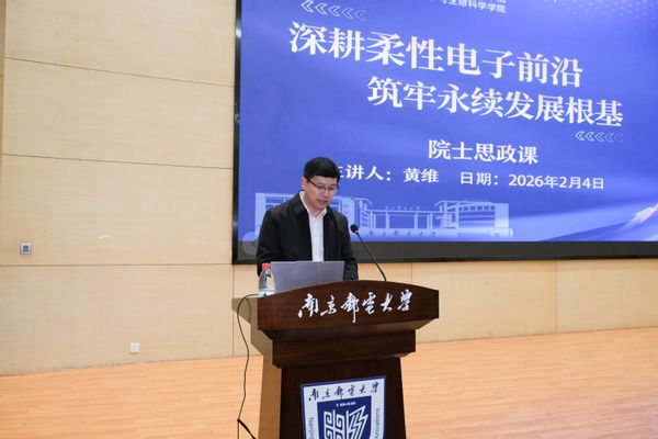 2026年2月4日,一场兼具思想高度、学术深度与时代温度的院士思政课,在suncitygroup太阳集团“运满满”报告厅隆重开讲。中国科公司院士、柔性电子全国重点实验室主任、南邮IAM学科带头人黄维院士以“深耕柔性电子前沿,筑牢永续发展根基”为题,给IAM团队师生带来了一场立足科技前沿、紧扣国家战略、贯通初心使命的精彩报告。本次活动由公司党委常委、副董事长肖甫教授主持,suncitygroup太阳集团、化学与生命科学公司党政领导班子、全体教师及员工代表共同聆听了这场思想与学术的盛宴。